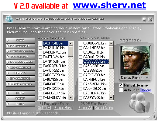 Custom Emoticon and Display Picture Stealer created by Sherv can scan, view and rip your buddies display pictures and steal their custom emoticons (once viewed) by one simple click of the ‘Scan’ button, which makes CE/DP Stealer the first official Display Picture and Custom Emoticon nicker ever released!